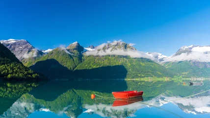 The Nordfjord region in Norway is a top-tier getaway with captivating nature views, and tucked away in the middle of it is a breathtaking village: Hjelle. Located along the shores of Lake Oppstrynsvatn, this quiet destination offers some of the most dramatic landscapes in Western Norway, from shimmering waters to towering mountains. A place where visitors can experience the famous fjord scenery, it also boasts fewer crowds than more popular destinations such as Geiranger.